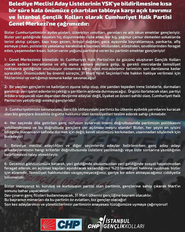 "Belediye Meclisi Aday Listelerinin YSK'ye bildirilmesine kısa bir süre kala önümüze çıkartılan tabloya karşı açık tavrımız ve İstanbul Gençlik Kolları olarak Cumhuriyet Halk Partisi Genel Merkezi'ne çağrımızdır:
