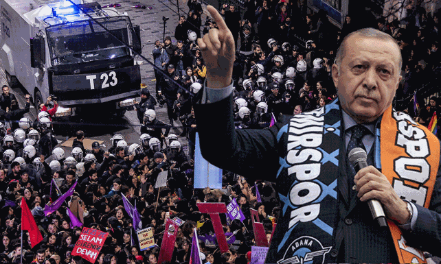 AKP'li Cumhurbaşkanı Recep Tayyip Erdoğan, Adana'da konuşuyor. Erdoğan, 8 Mart'ta Taksim'de yapılan Feminist Gece Yürüşüyü'ndeki ıslık sesleri ve atılan sloganların ezan vaktine denk gelmesine ilişkin "Taksim'de CHP ve HDP'nin öncülüğünde güya kadınlar günü için bir araya gelip bir grup ezana sloganlarla ıslıklarla terbiyesizlik ettiler" sözlerini kullandı. Çoğunluğu kadın on binlerce kişinin katıldığı bu yıl 17'inci kez düzenlenen yürüyüşe polis sert şekilde müdahale etmişti.