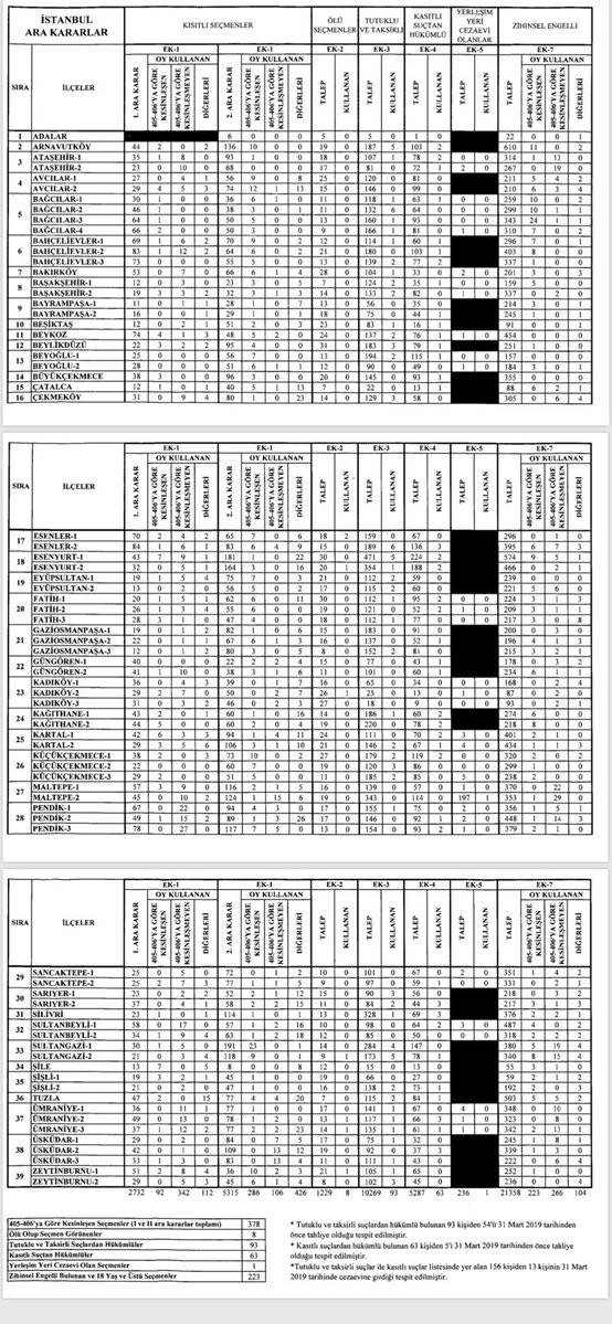 Yüksek Seçim Kurulu'nun (YSK) AKP'nin "İstanbul'da 41.132 kısıtlı seçmen var" iddiasına ilişkin yaptığı inceleme sonuçlandı. YSK'nin bulgularına göre İstanbul'un tüm ilçelerinde 766 'kısıtlı seçmen' bulunuyor. CHP İstanbul İl Başkanı Canan Kaftancıoğlu YSK'nin kısıtlı seçmenlerle ilgili çizelgesini paylaştı.