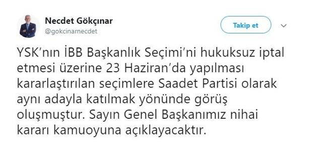 Saadet Partisi'nin 31 Mart yerel seçimlerindeki İstanbul Büyükşehir Belediye Başkan Adayı Necdet Gökçınar sosyal medya üzerinden yaptığı açıklamada yeniden seçimlere katılacağını açıkladı. Gökçınar mesajında, "YSK’nın İBB Başkanlık Seçimi’ni hukuksuz iptal etmesi üzerine 23 Haziran’da yapılması kararlaştırılan seçimlere Saadet Partisi olarak aynı adayla katılmak yönünde görüş oluşmuştur. Sayın Genel Başkanımız nihai kararı kamuoyuna açıklayacaktır."dedi.