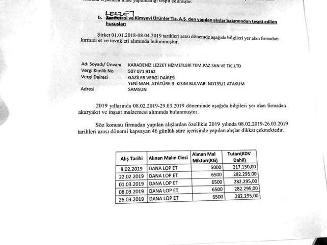 Yapılan inceleme sonrası hazırlanan raporda ilginç detaylara rastlandı. Belediye Başkanı Cemil Deveci’ye sunulan raporda, “Söz konusu firmadan yapılan alışlara ilişkin nakliye bakımından nakliye faturası veya taşıma irsaliyesi bulunmadığı, şirketin söz konusu eti depolayabilecek soğuk hava deposunun bulunmadığı, 08. 04.2019 tarihinde yapılan fiili stok sayımında şirket stoklarında hiç et bulunmadığı tespit edilmiş olup 2 ay gibi kısa bir sürede 37,5 ton etin tüketilmesinin iktisadi ve teknik icaplara uygun düşmediği, şirketin söz konusu et alımlarının olduğu 01.01.2019-31.03.2019 dönemini kapsayan 3 aylık sürede tüm yemek, gıda ve benzeri satış hasılatları toplamının 1.064.197,68 TL olmasına karşın 1.628.625 TL tutarındaki etin tamamının tüketilmiş olunmasının iktisadi ve teknik icaplara uygun düşmediği tespit edilmiştir” denildi.