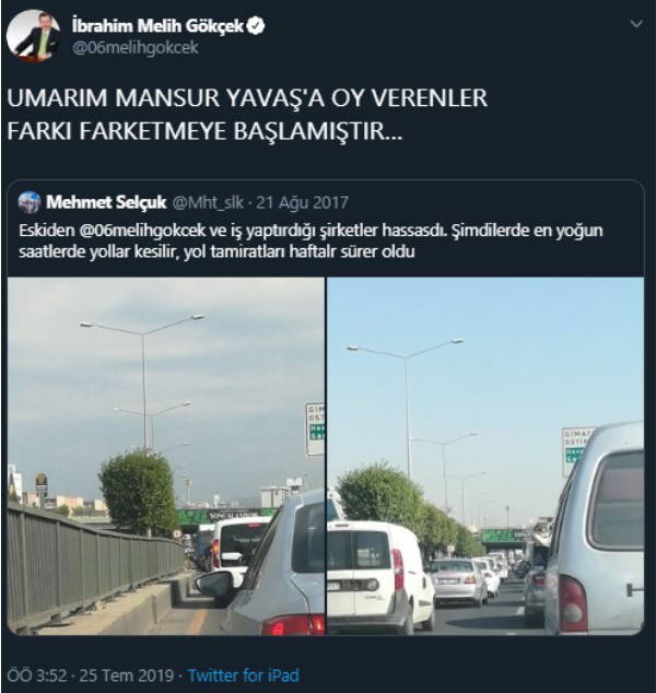2017 yılında atılan, "Eskiden Melih Gökçek ve iş yaptırdığı şirketler hassasdı. Şimdilerde en yoğun saatlerde yollar kesilir, yol tamiratları haftalar sürer oldu" şeklindeki bir paylaşıma Gökçek, "Umarım Mansur Yavaş'a oy verenler farkı fark etmeye başlamıştır" diye yazdı.
