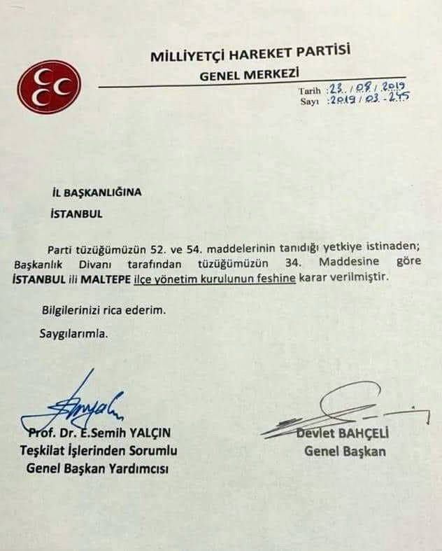 MHP Genel Başkanı Devlet Bahçeli ve Teşkilat İşlerinden Sorumlu Genel Başkan Yardımcısı Prof. Dr. Semih Yalçın imzasıyla gönderilen yazıda parti tüzüğünün 52. ve 54 maddeleri ile Başkanlık Divanı tarafından tüzüğün 34. maddesine göre ilçe teşkilatının feshedildiği bildirildi.
