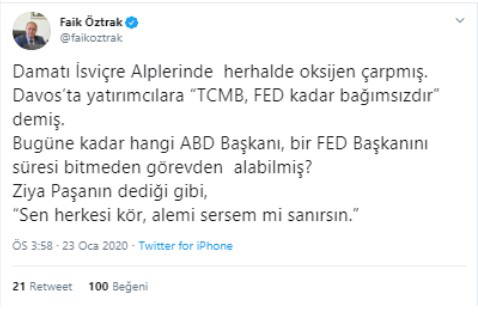 Faik Öztrak'ın kişisel twitter hesabından yaptığı açıklama şöyle;