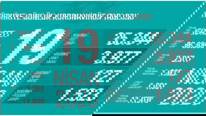 Sağlık Bakanı Koca, son 24 saatte 127 kişinin daha yaşamını yitirdiğini,3 bin 977 yeni vaka olduğunu açıkladı. Toplam ölü sayısı 2 bin 17'e yükselirken, koronavirüs vaka sayısı ise 86 bin 306'a yükseldi.