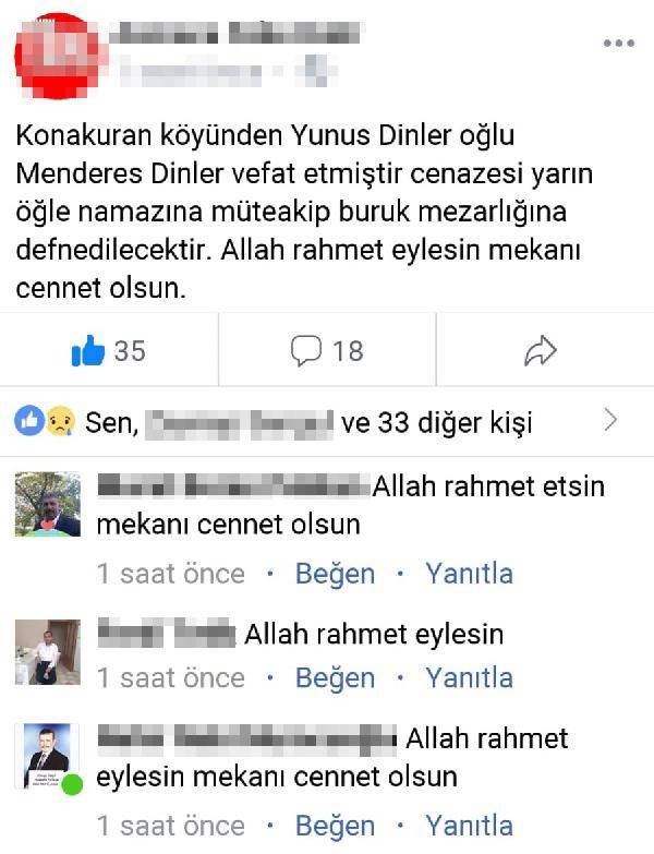 Belediye görevlilerine, "Menderes ağabeyim hayatını kaybetti. Ölüm ilanını vermek istiyorum" diyen Dinler, okunacak kağıda ise, cenazesinin ertesi gün, öğle namazına müteakip teyzesinin evinden Buruk Mezarlığı'na kaldırılacağını yazdırdı. Görevlilerin ilçe merkezinin farklı noktalarında bilgilendirme amaçlı kurulan hoparlörlerden anons yapmasının ardından Dinler'in arkadaşları da büyük üzüntü yaşadı.