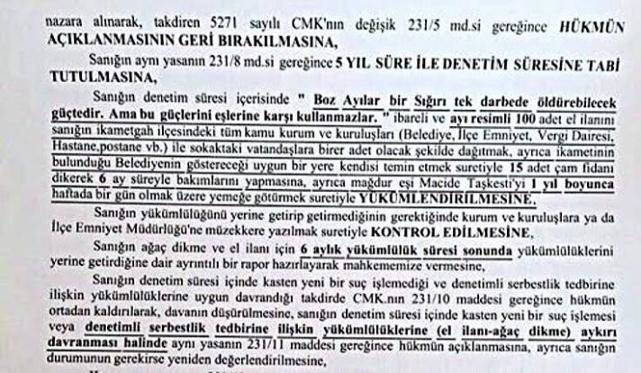 Gazete Duvar'ın aktardığı haberinde, mahkeme sanığa "Boz ayılar bir sığırı tek darbede öldürebilecek güçtedir. Ama bu güçlerini eşlerine karşı kullanmazlar" yazılı ve ayı resimli 100 adet el ilanı dağıtma cezası verdi.
