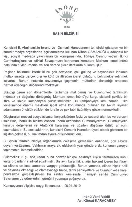 Nilhan Osmanoğlu adlı kadının İsmet İnönü ile ilgili attığı iftiraya ilişkin İnönü Vakfı’ndan açıklama: “Yargıya başvuracağız. Cumhuriyet’e karşı yapılan bu pervasız saldırı karşısında cumhuriyet savcılarını göreve davet ediyoruz” dedi.