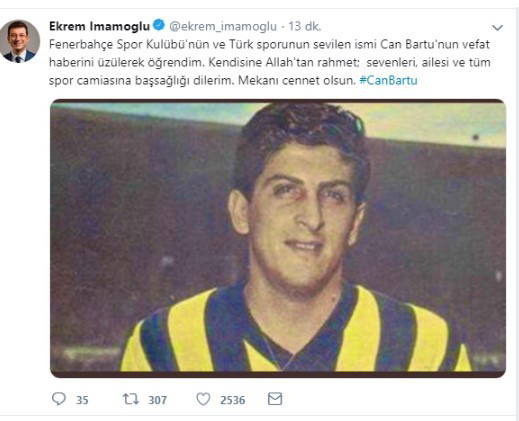 CHP'li İstanbul Büyükşehir Belediye Başkanı Ekrem İmamoğlu, Twitter'dan paylaştığı mesajda, "Fenerbahçe Spor Kulübü’nün ve Türk sporunun sevilen ismi Can Bartu'nun vefat haberini üzülerek öğrendim. Kendisine Allah'tan rahmet; sevenleri, ailesi ve tüm spor camiasına başsağlığı dilerim. Mekanı cennet olsun. #CanBartu" dedi.