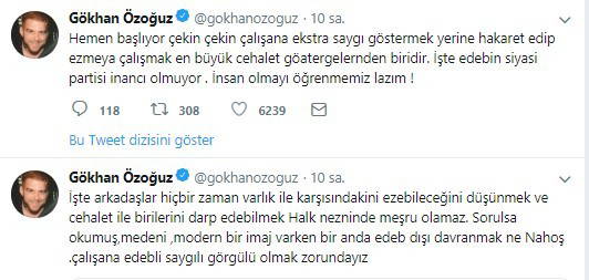Twitter hesabından paylaşım yapan Gökhan Özoğuz, şu sözlerle sitem etti: "İşte arkadaşlar hiçbir zaman varlık ile karşısındakini ezebileceğini düşünmek ve cehalet ile birilerini darp edebilmek Halk nezninde meşru olamaz. Sorulsa okumuş, medeni, modern bir imaj varken bir anda edep dışı davranmak ne Nahoş. Çalışana edepli saygılı görgülü olmak zorundayız.