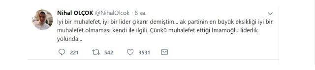 15 Temmuz gecesi eşi Erol Olçok ve oğlu Abdullah Tayyip Olçok'u kaybeden Nihal Olçok, Yüksek Seçim Kurulu'nun (YSK) iptal ettiği İstanbul Büyükşehir Belediye Başkanlığı seçimine ilişkin olarak bir mesaj paylaştı.