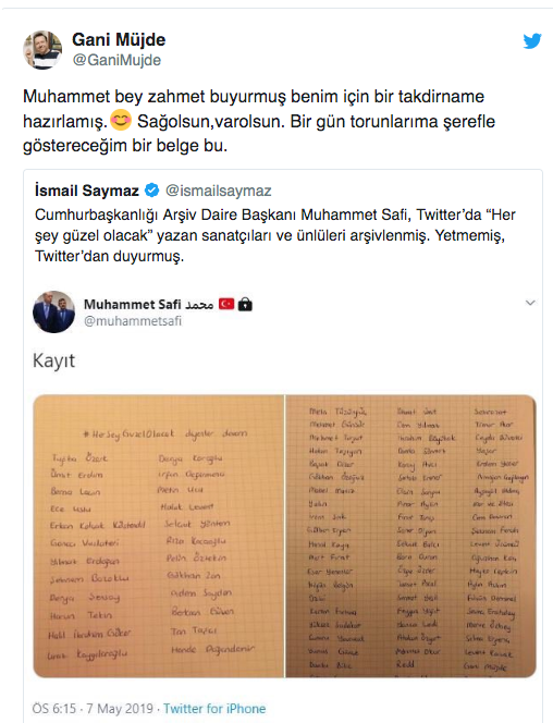Gani Müjde, liste hakkında Twitter hesabından yaptığı paylaşımda "Muhammet Bey zahmet buyurmuş benim için bir takdirname hazırlamış. Sağ olsun, var olsun. Bir gün torunlarıma şerefle göstereceğim bir belge bu" dedi.