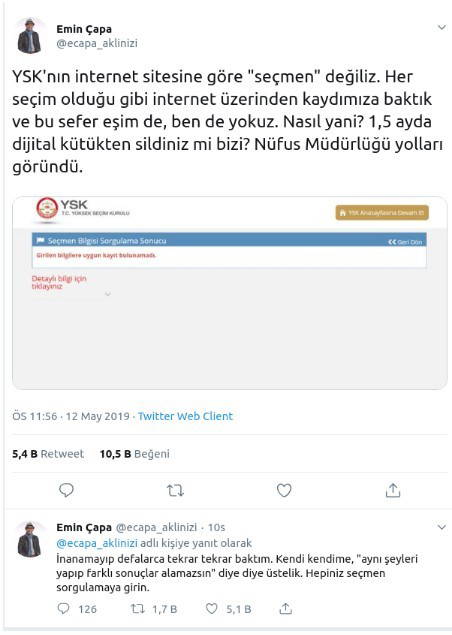 YSK'nin İstanbul seçiminin tekrarlanması kararından sonra seçmen kütüklerini sorguluyor. Daha önce Ekşi Sözlük yazarının gündeme getirdiği seçmen kaydının silinmesi olayı bu kez Emin Çapa tarafından dile getirildi.