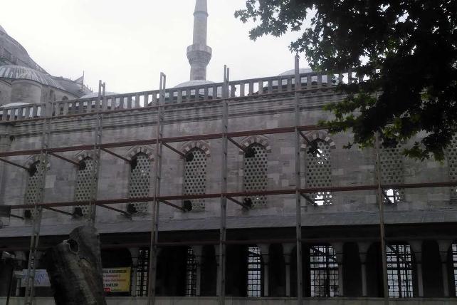 Osmanlı mimarisinin ilk ve tek 6 minareli camisi olan ve çinileri dolayısıyla "Mavi Cami/Blue Mosque" diye anılan Sultanahmet Camisi, yıllar içinde birçok kez restore edildi. Osmanlı padişahı I. Ahmed tarafından mimar Sedefkar Mehmet Ağa'ya yaptırılan ve 1617'da ibadete açılan caminin "en kapsamlı restorasyonu" ise 6 Temmuz 2017'de başladı. 22 aydır süren çalışmalar sırasında caminin avlu duvarının etrafına da çelik iskeleler kuruldu.