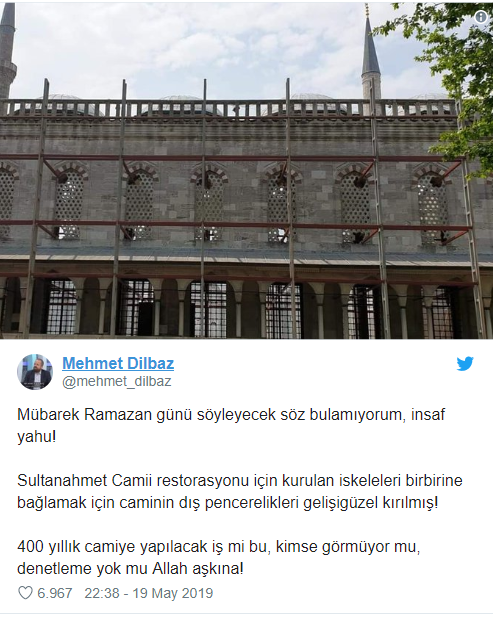 Her gün binlerce turistin ziyaret ettiği camide süren çalışmalara ilişkin AA'ya konuşan İstanbul Vakıflar 1. Bölge Müdürü Mürsel Sarı, "Sultanahmet Camisi, İstanbulumuzun, ülkemizin en önemli eserlerinden biri. Mimar Sinan üslubunda Mimar Sedefkar Mehmet Ağa tarafından 1617 yılında inşaatı tamamlanmış. Çok önemli bir eser olması dolayısıyla ibadeti aksatmamamız gerekiyor, yoğun ziyaretçi akınını da engellemeden restorasyonu yapmak gerekiyordu. Onun için daha dikkatli çalışmayı gerektiren bir restorasyon" demişti.