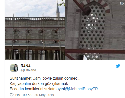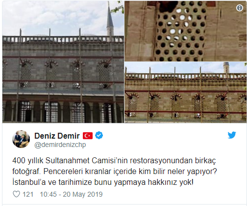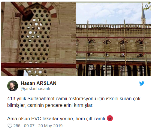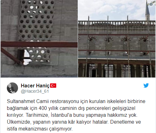 400 yıllık Sultanahmet Camisi'nin konservasyon ve restorasyon çalışmaları kapsamında dış cephedeki pencerelerin içlerinden metal çubuklar geçirilmesi için kırılması tepki çekti.