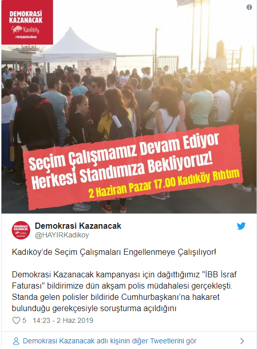 25 Mayıs Pazartesi gününden itibaren Kadıköy İskele Meydanı’nda AKP dönemi İBB İsraf Faturası bildirisi dağıtılan Demokrasi Kazanacak kampanyası standına 1 Haziran akşam saatlerinde polis müdahalesi gerçekleşti.