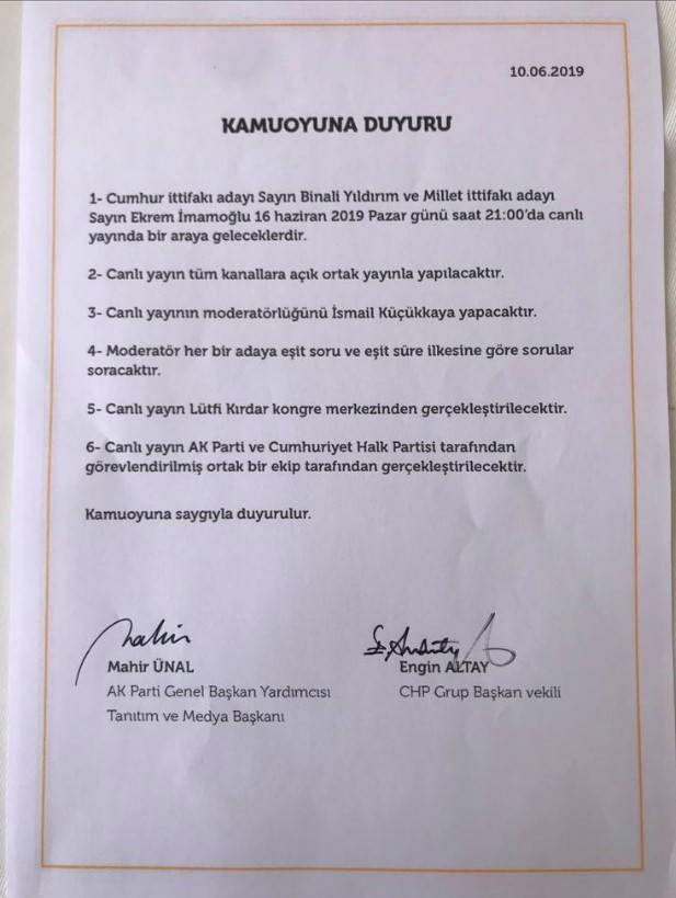Çalışmaların neticesinde mutabık kaldıkları bir protokolü paylaşacaklarını aktaran Ünal, "Öncelikli olarak 23 Haziran'da gerçekleşecek olan İstanbul seçimlerinin ülkemize hayırlar getirmesini şimdiden temenni ediyoruz. 'Hayırlı, uğurlu olsun' diyoruz. Cumhur İttifakı adayı Sayın Binali Yıldırım ve Millet İttifakı adayı Sayın Ekrem İmamoğlu 16 Haziran 2019 Pazar günü saat saat 21.00'de canlı yayında bir araya geleceklerdir." diye konuştu.