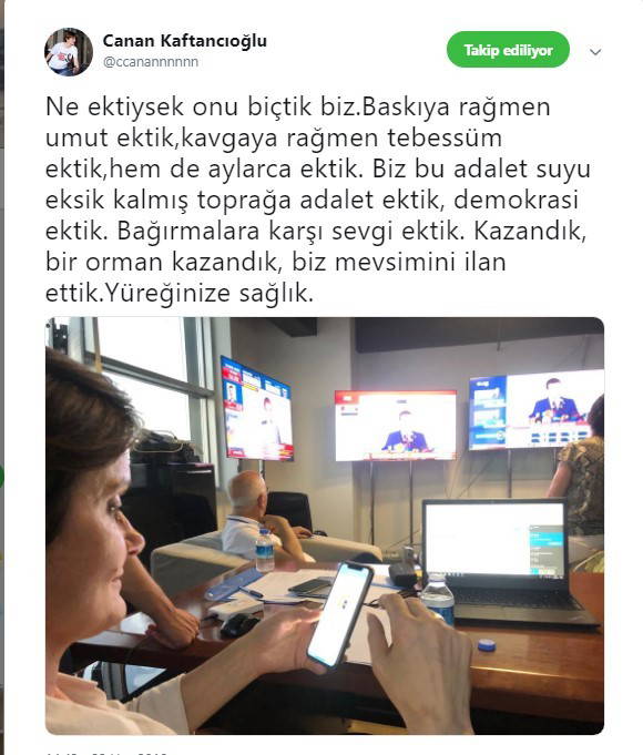 Ne ektiysek onu biçtik biz.Baskıya rağmen umut ektik,kavgaya rağmen tebessüm ektik,hem de aylarca ektik. Biz bu adalet suyu eksik kalmış toprağa adalet ektik, demokrasi ektik. Bağırmalara karşı sevgi ektik. Kazandık, bir orman kazandık, biz mevsimini ilan ettik.Yüreğinize sağlık.