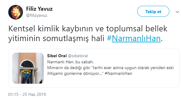 Tabelanın asıldığını yazar Sibel Oral twitter hesabından paylaştığı fotoğrafla duyurdu. Oral'ın paylaşımının ardından çok sayıda sosyal medya kullanıcısı #NarmanlıHan etiketini kullanarak tepkisini gösterdi.