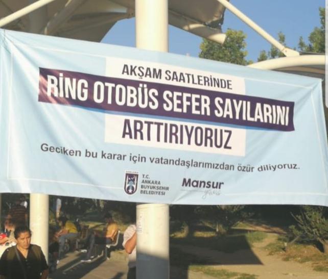 Durakları "özür dileriz" pankartı ile donatıp ring otobüs sefer sayılarını akşam saatlerinde artırdıklarını duyurdu. (Odatv)