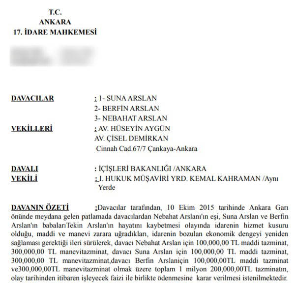 Odatv'de yer alan habere göre IŞİD'in saldırısında hayatını kaybeden inşaat işçisi Tekin Arslan için; eşi Nebahat Arslan ile çocukları Suna Arslan ve Berfin Arslan bir dava açtı.