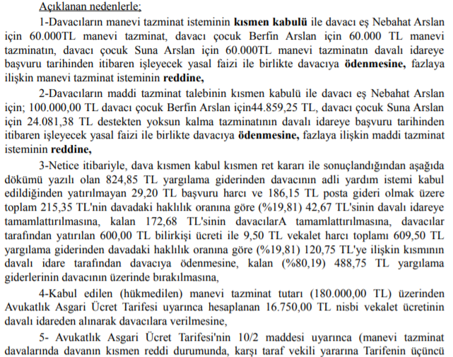 Davacılardan Nebahat Arslan, Suna Arslan ve Berfin Arslan; Tekin Arslan'ın saldırıda hayatını kaybetmesiyle ilgili olarak idarenin hizmet kusuru olduğunu, maddi ve manevi zarara uğradıklarını, idarenin bozulan ekonomik dengeyi yeniden sağlaması gerektiğini ileri sürdü.