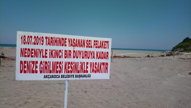 Öte yandan sel nedeniyle Akçakoca’da ikinci bir duyuruya kadar denize girmek yasaklandı. Sahillerin ağaçlarla dolması, denizin çamur rengine bulanması nedeniyle alınan karar sonrasında plajlara, ‘18 Temmuzda yaşanan sel felaketi nedeniyle ikinci bir duyuruya kadar denize girilmesi kesinlikle yasaktır’ tabelaları konuldu.
