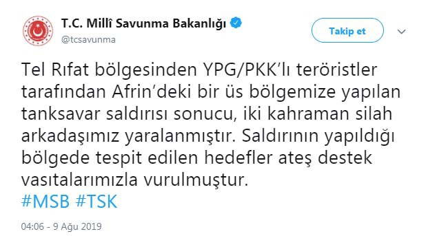 Bakanlığın Twitter hesabından yapılan açıklamada, "Tel Rıfat bölgesinden YPG/PKK’lı teröristler tarafından Afrin’deki bir üs bölgemize yapılan tanksavar saldırısı sonucu, 2 kahraman silah arkadaşımız yaralanmıştır. Saldırının yapıldığı bölgede tespit edilen hedefler ateş destek vasıtalarımızla vurulmuştur" denildi.