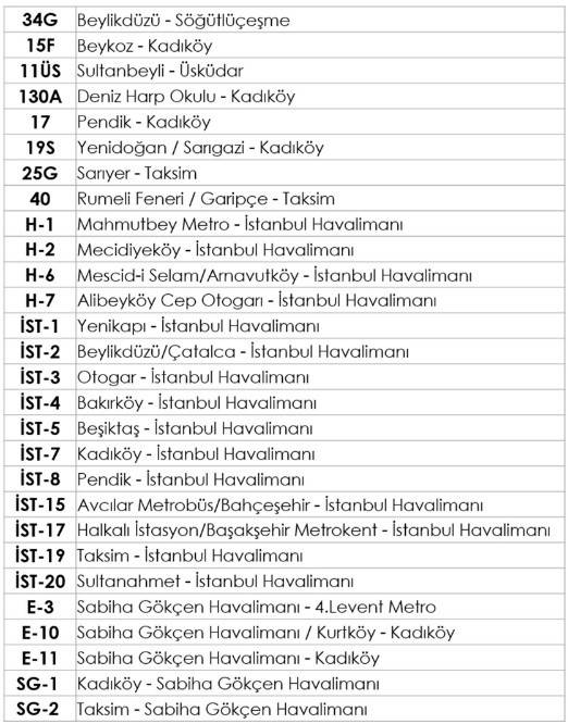 Listeye göre gece saatlerinde 15'i İstanbul Havalimanı'na olmak üzere toplam 28 hatta sefer düzenleniyor.