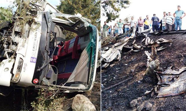 Kaza sonrası otobüste çıkan ve yol kenarındaki ağaçlara da sıçrayan yangın, itfaiye ekiplerinin müdahalesiyle söndürüldü.