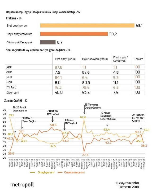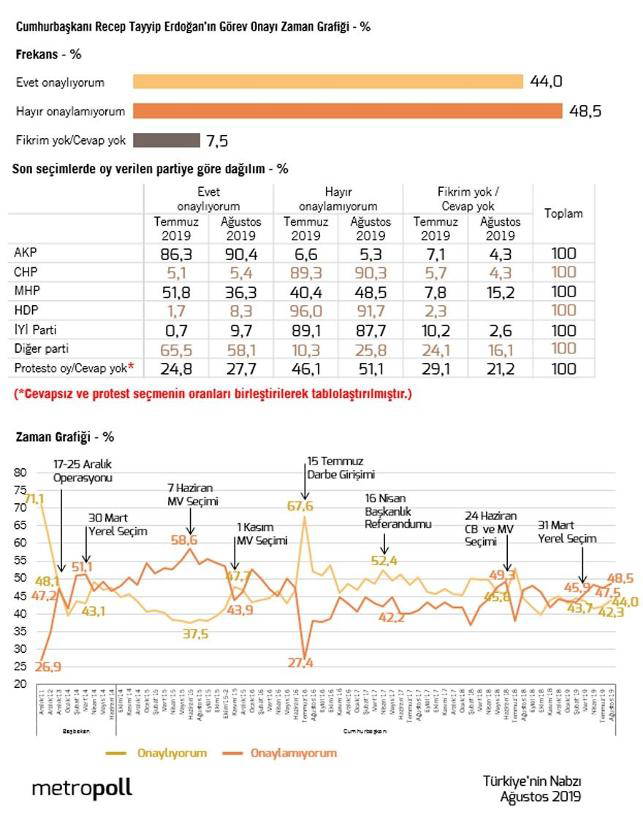 Ankete göre Cumhurbaşkanı Erdoğan'a görev onayı verenlerin oranı yüzde 44'e geriledi. "Onaylamıyorum" diyenlerin oranı da 1 yılda yüzde 38'den 48'e yükseldi. Geçen yılın aynı döneminde Erdoğan'a "görev onayı verenlerin" oranı 53.1 olarak ölçülmüştü.
