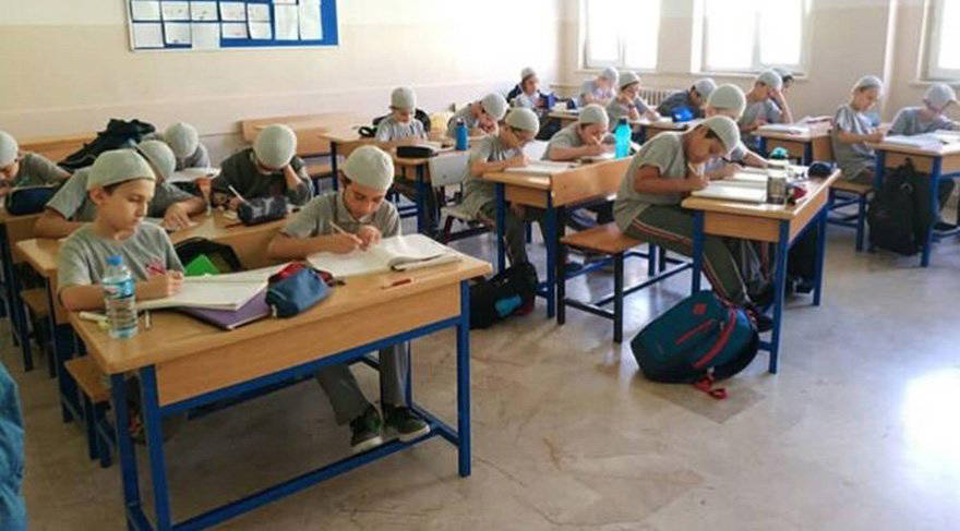 Sınıfta yalnızca erkek öğrenciler var. Takkeleri takılı olarak, ders işlerken görülüyorlar. İdare takkeleri getirdiğini ileri sürdüğü veliye de teşekkür etmeyi ihmal etmiyor. Öğrenciler, geçen cuma günü Miraç Kandili'nde götürüldükleri Hasanpaşa Camisi'nde ise cami içerisinde takkesiz olarak ders alıyor.