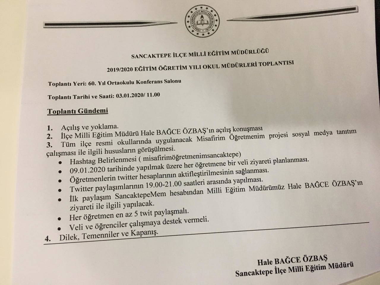 Sancaktepe İlçe Milli Eğitim Müdürü Hale Bağce Özbaş 2018 yılında sona eren “Misafirim Öğretmenim” uygulamasının ilçede yeniden hayata geçirilmesine yönelik okul müdürlerinden talepte bulundu.