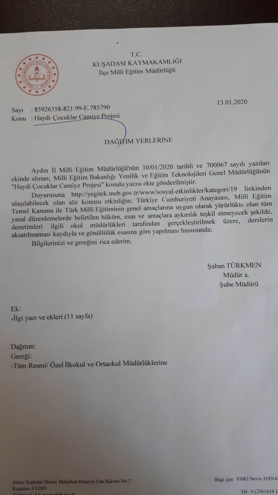 Kuşadası İlçe Milli Eğitim Müdürlüğü’nden ilçedeki tüm resmi ve özel ilkokul ve ortaokul müdürlüklerine gönderilen yazı şöyle: “Aydın İl Milli Eğitim Müdürlüğü’nün 10/01/2020 tarihli ve 700067 sayılı yazıları ekinde alınan, Milli Eğitim Bakanlığı Yenilik ve Eğitim Teknolojileri Genel Müdürlüğü’nün ‘Haydi Çocuklar Camiye Projesi’ konulu yazısı ekte gönderilmiştir. Duyurusuna http://yegitek.meb.gov.tr/www/sosyal-etkinlikler/kategori/19 linkinden ulaşılabilecek söz konusu etkinliğin; Türkiye Cumhuriyeti Anayasası, Milli Eğitim Temel Kanunu ile Türk Milli Eğitimi’nin genel amaçlarına uygun olarak yürürlükte olan tüm yasal düzenlemelerde belirtilen hüküm, esas ve amaçlara aykırılık teşkil etmeyecek şekilde, denetimleri ilgili okul müdürlükleri tarafından gerçekleştirilmek üzere derslerin aksatılmaması kaydıyla ve gönülllülük esasına göre yapılması hususunda ilgilerinizi ve gereğini rica ederim.”