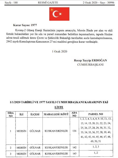 Cumhurbaşkanı Erdoğan, 2 Ocak 2020 tarihli Resmi Gazete’de 9 ayrı kamulaştırma kararına imza attı. Ancak bunlar arasında, “1977” sayılı karar dikkat çekti. Kararda, “Kıvanç-2 Güneş Enerji Santrali’nin yapımı amacıyla, Mersin ilinde yer alan ve ekli listede bulundukları yer ile ada ve parsel numaraları belirtilen taşınmazların, tapuda Hazine adına tescil edilmek üzere Çevre ve Şehircilik Bakanlığı tarafından acele kamulaştırılmasına, 2942 sayılı Kamulaştırma Kanununun 27’inci maddesi gereğince karar verilmiştir” denildi.
