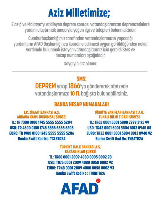 AFAD tarafından depremzedelere yardımcı olmak isteyenler için banka hesap numaraları paylaşıdlı.