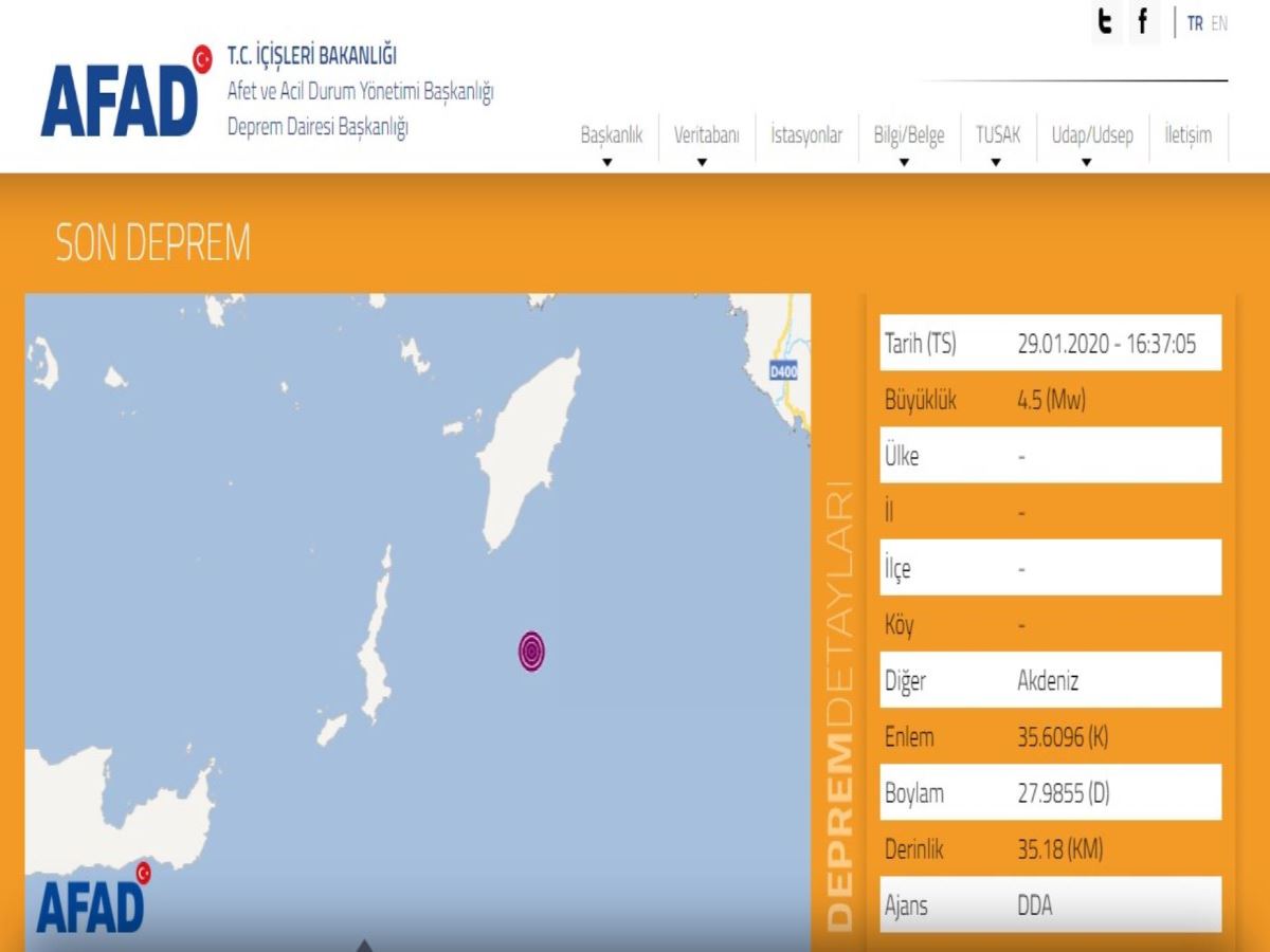Akdeniz'de Muğla'nın Marmaris ilçesi ile Yunanistan Dodecanese açıklarında 4,5 büyüklüğünde deprem meydana geldi. Afet ve Acil Durum Yönetimi Başkanlığının (AFAD) internet sitesinde yer alan bilgiye göre, Akdeniz'de Yunanistan Dodecanese'nin 35,43 kilometre, Marmaris ilçesinin ise 104,73 kilometre açıklarında saat 16.37'de 4,5 büyüklüğünde deprem kaydedildi. Deprem, 35,18 kilometre derinlikte gerçekleşti. Kandilli Rasathanesi ise depremin 4.6 büyüklüğünde olduğunu belirtti.