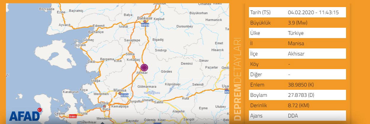 Kandilli Rasathanesi'nin yaptığı açıklamaya göre Manisa'nın Akhisar ilçesine bağlı Karaborklu köyünde 11:43'te, 4.0 büyüklüğünde bir deprem meydana geldi. AFAD ise depremin şiddetini 3.9 olarak kaydetti.