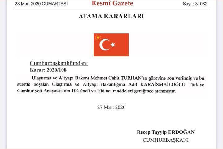 Turhan'ın yerine Adil Karaismailoğlu'nun atandığı belirtildi.