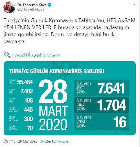 — Dr. Fahrettin Koca (@drfahrettinkoca) March 29, 2020