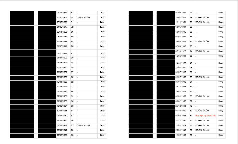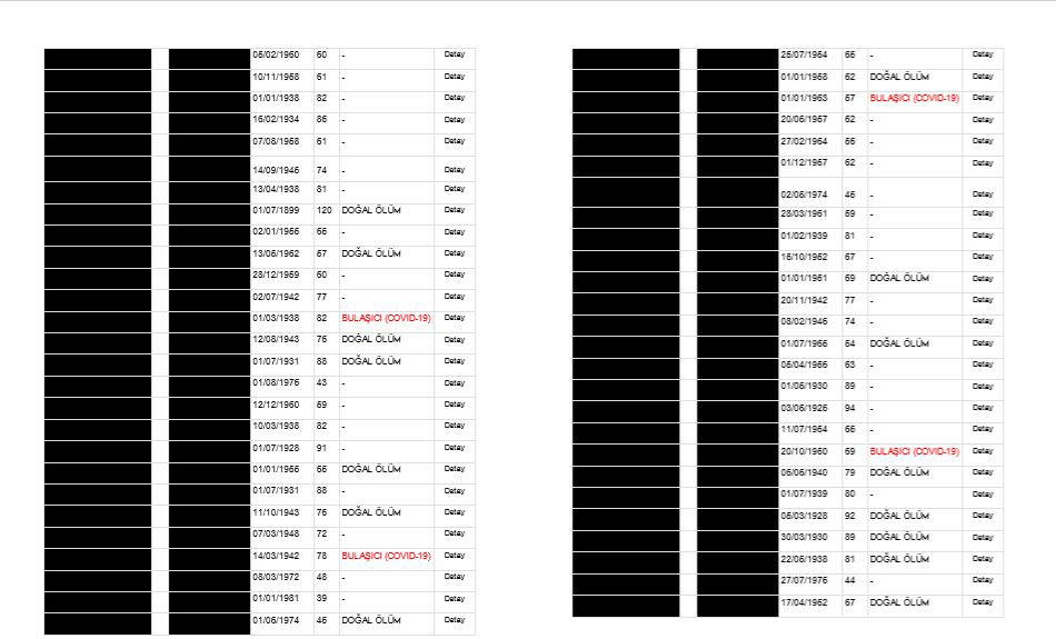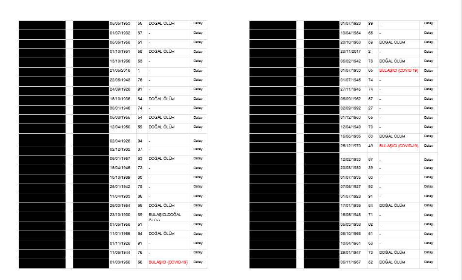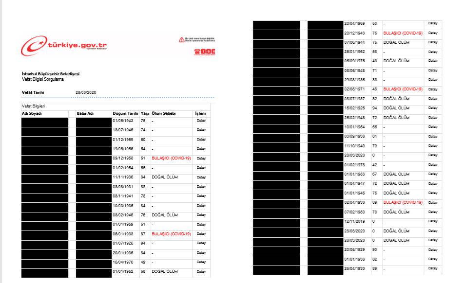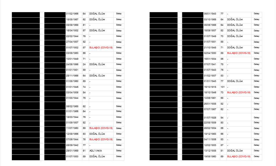 Öte yandan çarpıcı bir detay da gözden kaçmadı. E- devlet üzerinden paylaşılan listede, KİPTAŞ Pazarlama eski müdürü halen İstanbul Büyükşehir Belediyesi’nde danışmanlık görevinde bulunan Fatih Borhan da var. Borhan, koronavirüs teşhisi ile tedaviye alındığı hastanede 45 yaşında yaşamını yitirmişti. Ancak Borhan'ın yer aldığı vefat listesinde ölüm nedeni belirtilmemiş olarak görüldü.