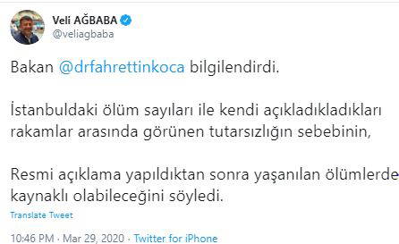 CHP Milletvekili Veli Ağbaba, Sağlık Bakanı Fahrettin Koca'nın kendisini bilgilendirdiğine dair bir tweet daha attı. Twitter'da yaptığı paylaşımında, "Bakan @drfahrettinkoca bilgilendirdi. İstanbuldaki ölüm sayıları ile kendi açıkladıkladıkları rakamlar arasında görünen tutarsızlığın sebebinin, Resmi açıklama yapıldıktan sonra yaşanılan ölümlerden kaynaklı olabileceğini söyledi" ifadelerine yer verdi.