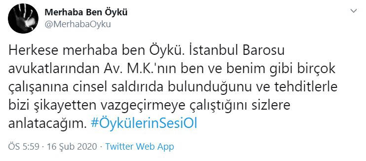 Sosyal paylaşım sitesi Twitter'da açıklama yapan "Merhaba Ben Öykü" kullanıcı isimli stajyer avukat, “Herkese merhaba ben Öykü. İstanbul Barosu avukatlarından Av. M.K.’nın ben ve benim gibi birçok çalışanına cinsel saldırıda bulunduğunu ve tehditlerle bizi şikayetten vazgeçirmeye çalıştığını sizlere anlatacağım” yazılı bir mesaj paylaştı. Kısa sürede yayılan mesaj sonrası İstanbul Barosu harekete geçti.