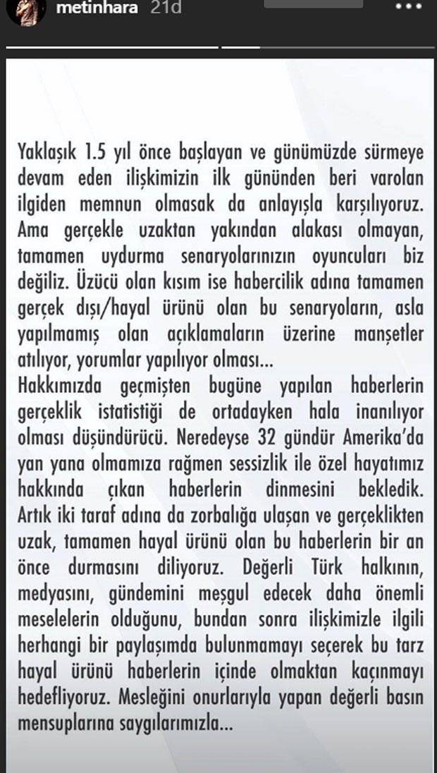 Hem Adriana Lima hem de Metin Hara el ele çekilmiş fotoğraflarını aynı anda Instagram'a yükledi. Hara, ardından yaptığı açıklamada " 32 gündür Amerika'da yan yanayız" ifadelerini kullanarak Türk basınına tepki gösterdi.