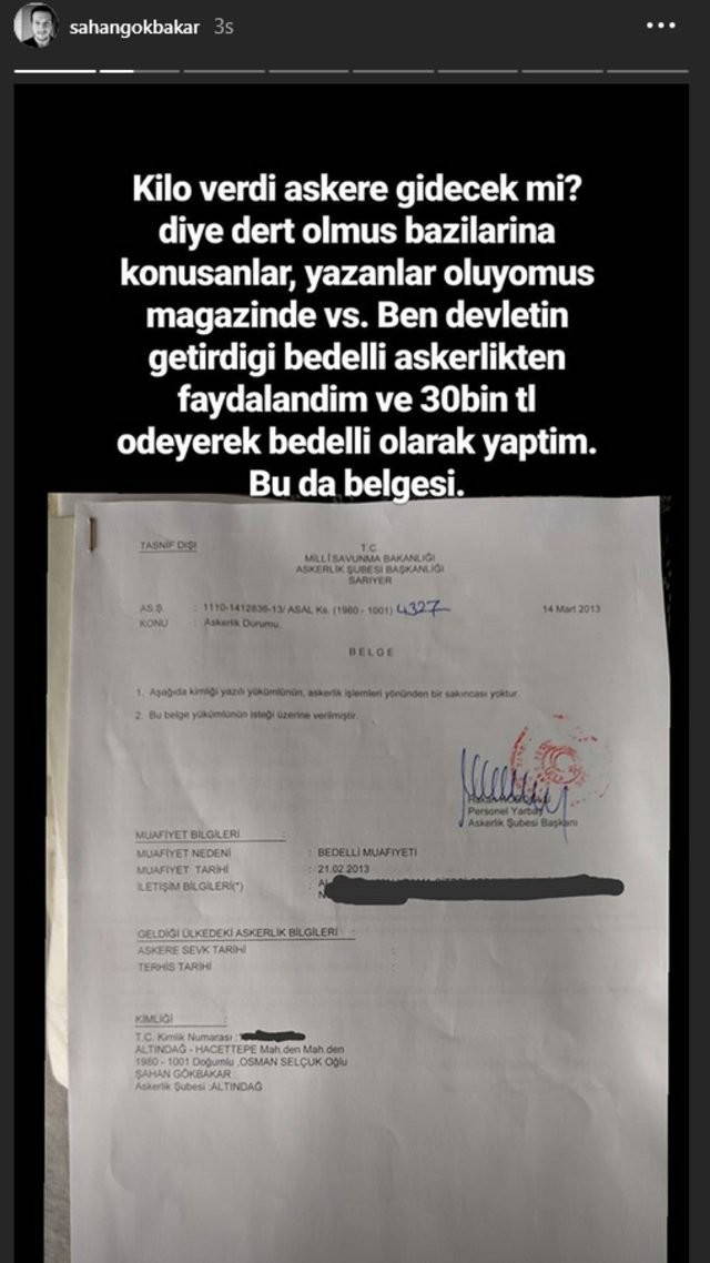 Şahan Gökbakar, hakkında çıkan askerlik iddialarına sosyal medya hesabından paylaştığı bir belgeyle cevap verdi. Şahan Gökbakar: “Kilo verdi, askere gidecek mi?” diye dert olmuş bazılarına. Konuşanlar, yazanlar oluyormuş magazinde vs. Ben devletin getirdiği bedelli askerlikten faydalandım ve 30 bin TL ödeyerek bedelli olarak yaptım. Bu da belgesi” notunu düşerek konuşulanlara son noktayı koydu.