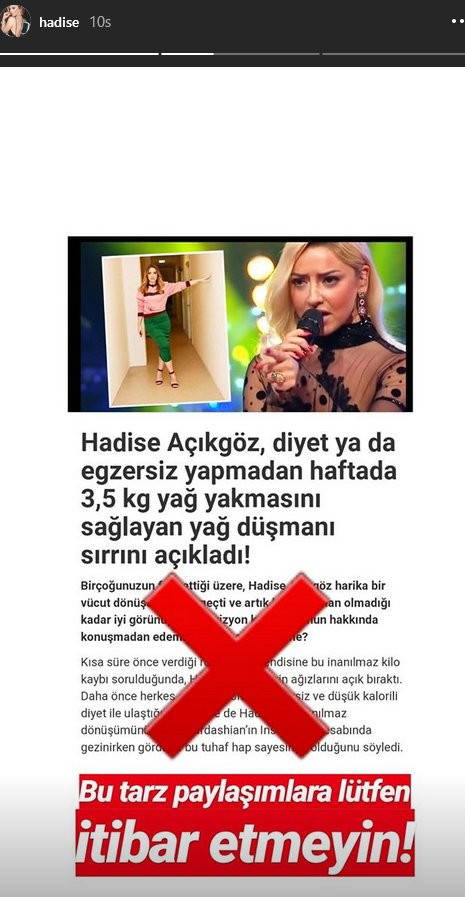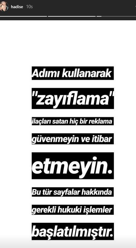 Ünlü isimlerin adlarını kullanarak zayıflama ilacı satan dolandırıcıların ağına takılan son isim şarkıcı Hadise oldu. Bir süredir klip çekimleriyle ilgilendiği için paylaşımlardan uzakta kalan Hadise, kendi adını kullanarak kilo verdirici ürün satan kişiler hakkında takipçilerini uyardı ve böyle şeylere itibar etmemelerini istedi. Şarkıcı daha sonra bu hesapla ilgili olarak yasal işlemlerin başlatıldığını da duyurdu.