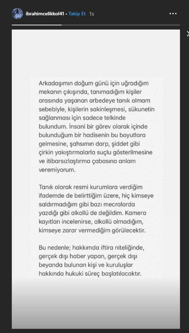 "Arkadaşımın doğum günü için uğradığım mekanın çıkışında, tanımadığım kişiler arasında yaşanan arbedeye tanık olmam sebebiyle, kişilerin sakinleşmesi, sükunetin sağlanması için sadece telkinde bulundum. İnsani bir görev olarak içinde bulunduğum bir hadisenin bu boyutlara gelmesine, şahsımın darp, şiddet gibi çirkin yakıştırmalarla suçlu gösterilmesine ve itibarsızlaştırma çabasına anlam veremiyorum.
