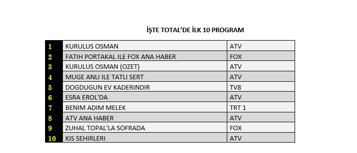 Total'de 1.sırada ATV’de yayınlanan “Kuruluş Osman”, 2.sırada “Fatih Portakal İle Fox Ana Haber”, 3.sırada “Kuruluş Osman”ın özeti yer aldı.