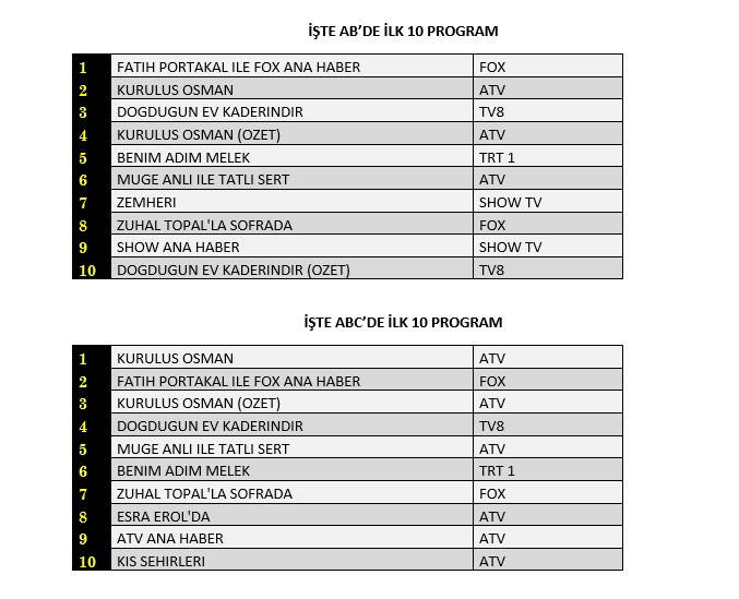 AB'de ise 1.sırada “Fatih Portakal İle Fox Ana Haber”, 2.sırada “Kuruluş Osman”, 3.sırada TV8’de yayınlanan “Doğduğun Ev Kaderindir” yer aldı.